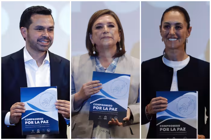 Los candidatos presidenciales Jorge Álvarez Máynez, Xóchitl Gálvez Ruiz y Claudia Sheinbaum Pardo, acudieron al llamado de la Conferencia del Episcopado Mexicano (CEM) a firmar el compromiso nacional por la paz propuesto por la Iglesia Católica para erradicar la violencia en el país.