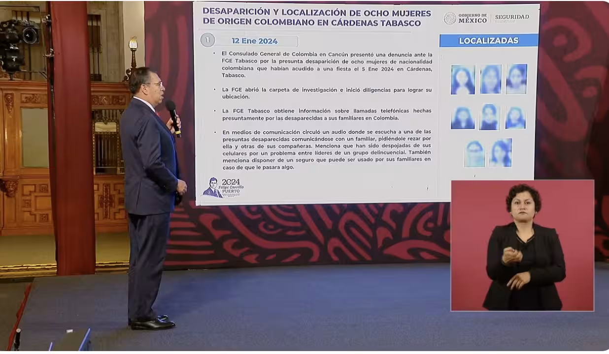 Durante la conferencia matutina del presidente Andrés Manuel López Obrador, Rodríguez Bucio detalló que el 12 de enero de 2024, el Consulado General de Colombia en Cancún presentó una denuncia por la desaparición de 8 colombianas tras asistir a una fiesta el 5 de enero en Cárdenas, Tabasco.