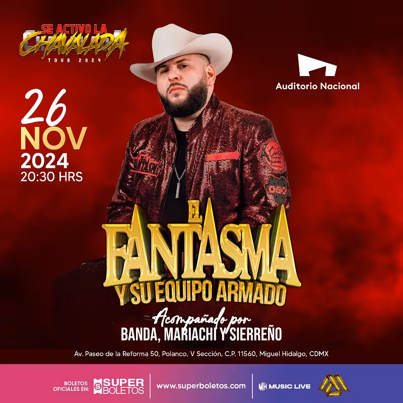 El próximo martes 26 de noviembre, el reconocido cantante Alexander García, mejor conocido como El Fantasma, llevará su Tour “Se Activó la Chavalada” al emblemático Auditorio Nacional de la Ciudad de México. El concierto, que comenzará a las 20:30 horas, promete ser una experiencia única, ya que El Fantasma estará acompañado de su “equipo armado”, incluyendo una impresionante combinación de banda, sierreño y mariachi, un formato nunca antes visto en este escenario. Boletos a la venta en el Sistema Ticketmaster y en taquillas del inmueble.