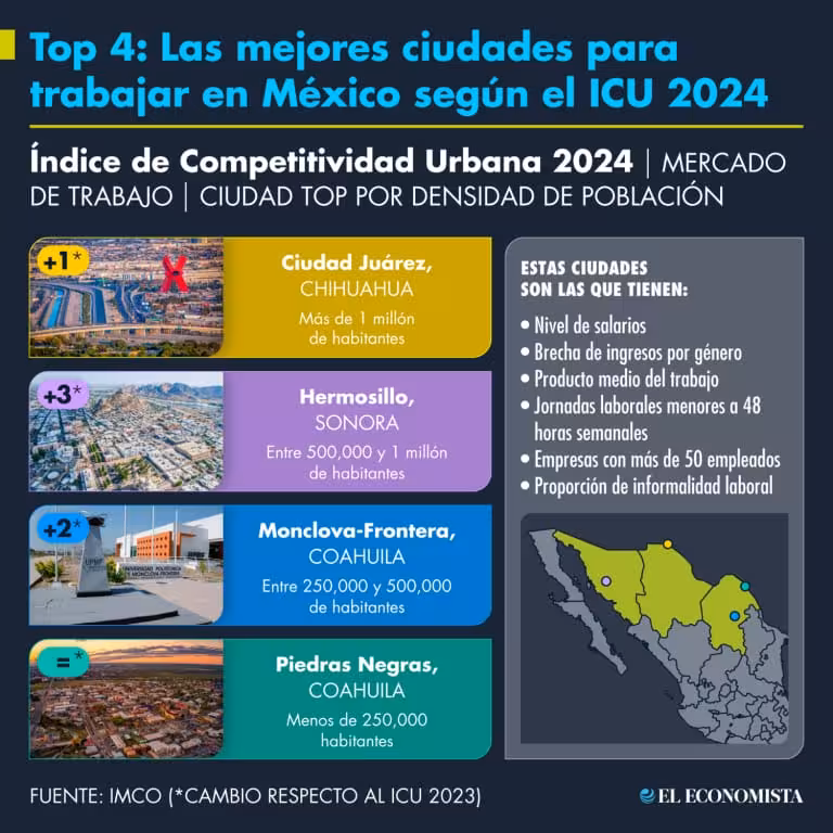 CIUDAD DE MÉXICO.- El Instituto Mexicano para la Competitividad (IMCO) publicó el Índice de Competitividad Urbana (ICU) 2024, destacando a Ciudad Juárez, Hermosillo, Monclova-Frontera y Piedras Negras como las mejores ciudades para trabajar en México.