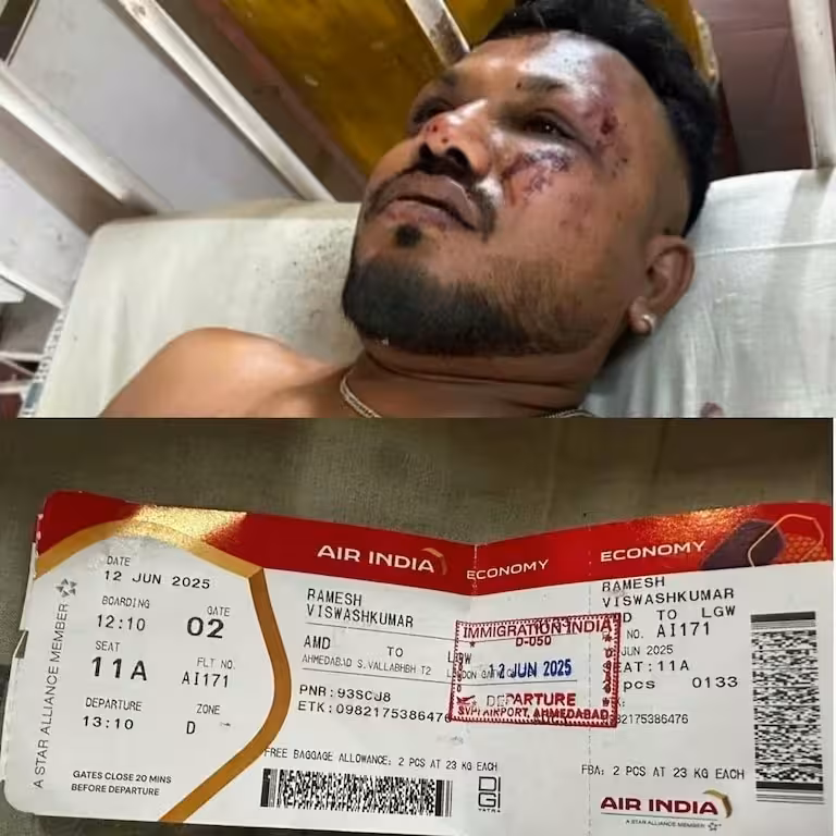 Ramesh, que viajaba en el asiento 11A junto a una salida de emergencia, resultó herido en el pecho, los ojos y los pies, pero logró caminar entre los escombros cubierto de cortes y suciedad. Declaró que escuchó un estruendo, vio cuerpos y restos, y se levantó para correr hasta pedir ayuda. Su ubicación junto a una salida pudo haber sido clave para su escape.